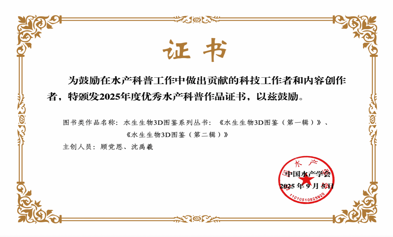 2025 年 9 月,中国水产学会公布了2025年度科学传播专家团队和优秀科普作品评选结果:珠江所牵头的“外来水生生物防控科学传播专家团队”再次入选“中国水产学会科学传播专家团队” ,牵头完成的《当心水中的“外来客”-外来水生生物防控必知》、“水生生物3D图鉴系列丛书:《水生生物3D图鉴(第一辑)》、《水生生物3D图鉴(第二辑)》”、“科学认识和防控外来水生生物系列科普视频”、“第一届“看鱼杯”全民垂钓外来鱼类线上比赛”等4项作品分获图书类、视频类、活动类优秀科普作品。