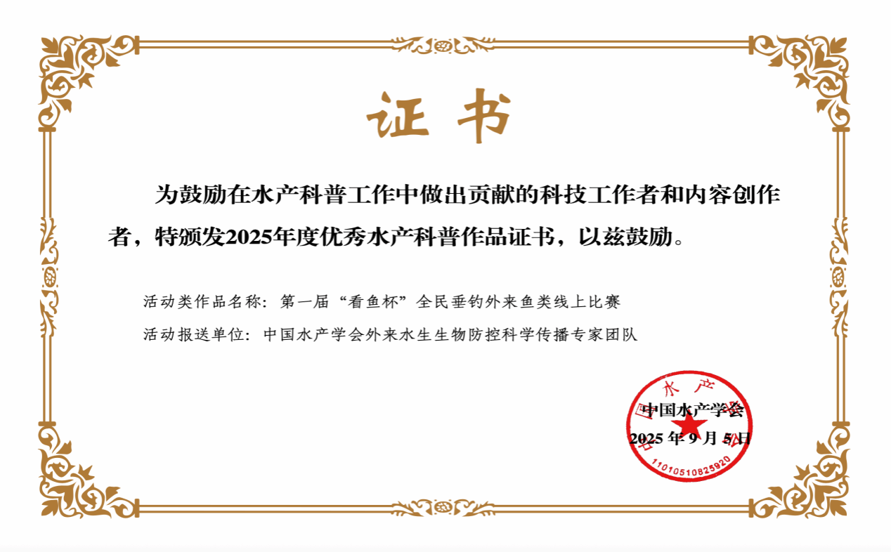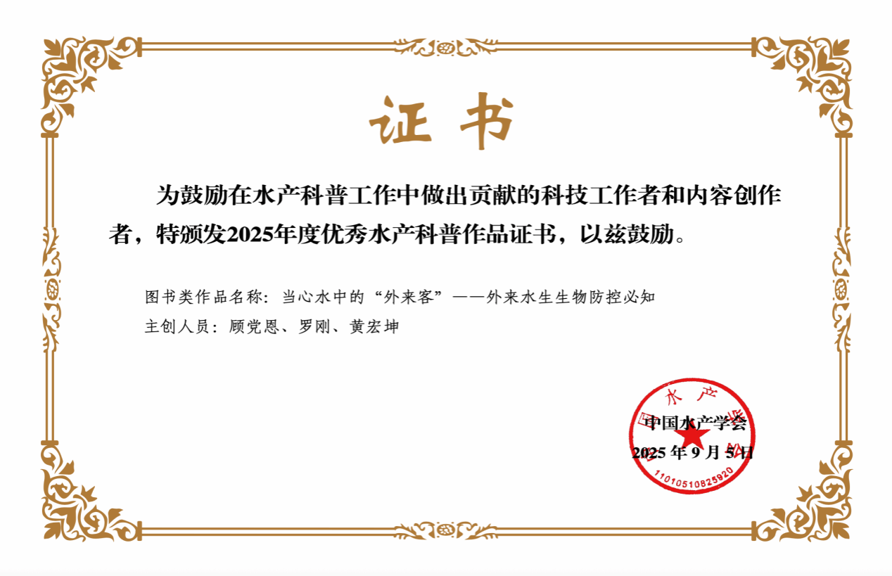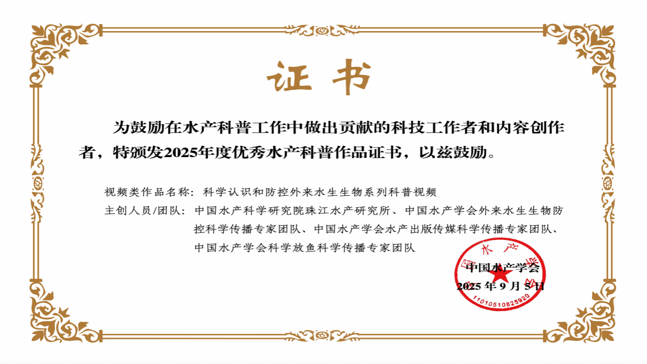 2025 年 9 月,中国水产学会公布了2025年度科学传播专家团队和优秀科普作品评选结果:珠江所牵头的“外来水生生物防控科学传播专家团队”再次入选“中国水产学会科学传播专家团队” ,牵头完成的《当心水中的“外来客”-外来水生生物防控必知》、“水生生物3D图鉴系列丛书:《水生生物3D图鉴(第一辑)》、《水生生物3D图鉴(第二辑)》”、“科学认识和防控外来水生生物系列科普视频”、“第一届“看鱼杯”全民垂钓外来鱼类线上比赛”等4项作品分获图书类、视频类、活动类优秀科普作品。